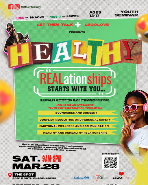 Let Them Talk, in collaboration with LegoLove, LLC and sponsored by Anthem, will host a youth-centered seminar focused on promoting healthy relationships, effective communication, and conflict resolution skills.